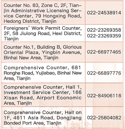 Locations and hotlines of the offices forhandling work permits for foreigners in Tianjin
