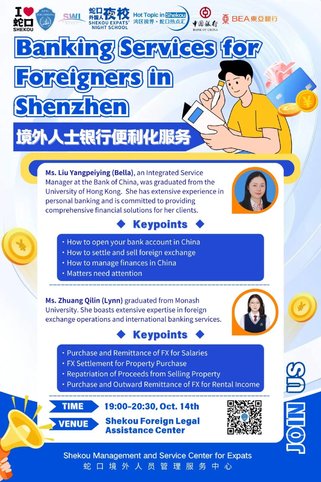 Organized by the Shekou Management and Service Center for Expats (Shekou MSCE), the session will be led by English-speaking banking professionals from the Bank of China (BOC) and the Bank of East Asia (BEA).