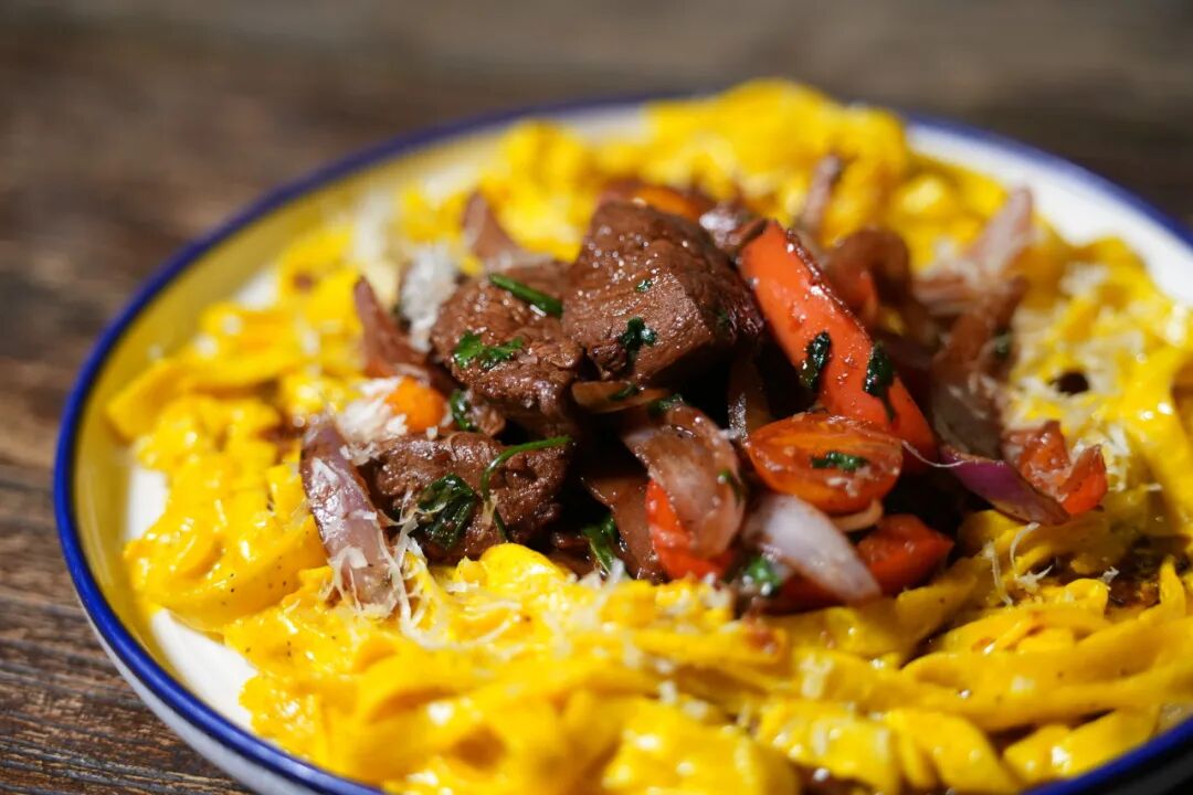 "What makes lomo saltado distinctive is its balance of contrasts: savory and tangy, juicy and smoky. I can serve it with Peruvian-style pasta, which is infused with Peruvian yellow chili. The dish brings together European flavors through the pasta and Chinese influence through the wok technique, reflecting Peru's layered culinary heritage."