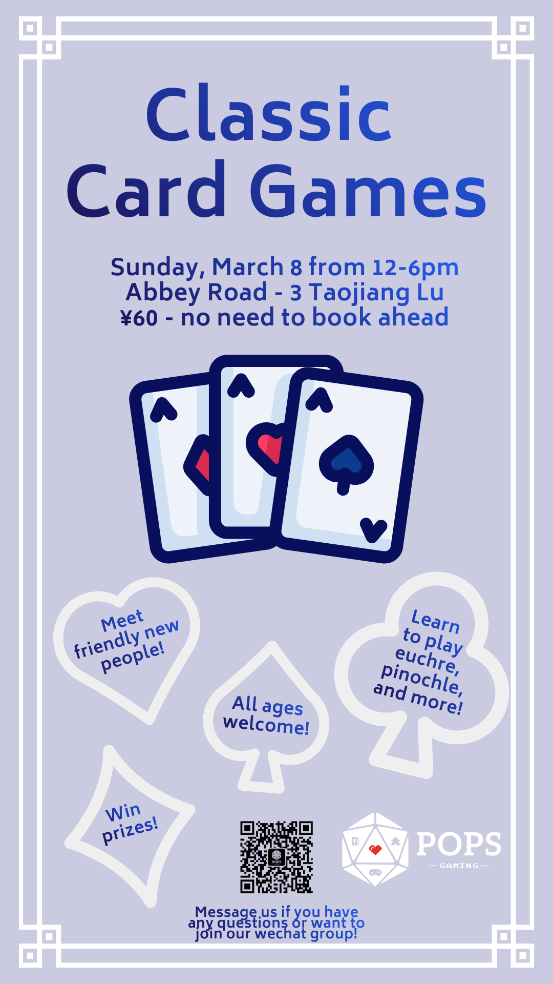 A casual afternoon of classic card games. For an entry fee of RMB60, attendees can meet new people, learn to play games like euchre and pinochle, and have a chance to win prizes.