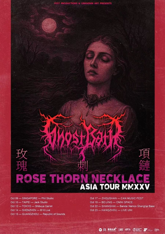 Ghost Bath brings their haunting blend of black metal intensity and post‑rock lyricism to Guangzhou. Founded in North Dakota in 2012, the band first drew intrigue with their mysterious ‘Chongqing origins’ before emerging on the global stage with Nuclear Blast. Their latest album Rose Thorn Necklace pushes their sound further—walls of distortion, searing screams, and fragile piano lines colliding in waves of despair and beauty. Expect a performance of raw emotion and stark atmosphere, where darkness and light entwine in unforgettable catharsis.