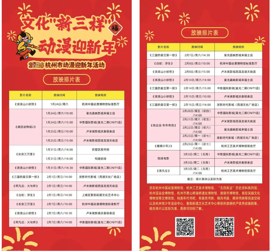 This year’s event runs through the Lantern Festival. Hangzhou will host a series of public animation film screenings and showcases of outstanding Chinese animated works at cinemas, museums, reading spaces, and other cultural venues across the city. The lineup includes renowned Chinese animated films such as Nobody, I Am What I Am 2, Into the Mortal World, Chang’an, White Snake: Afloat, and Three Kingdoms: Starlit Heroes, alongside international hits like Zootopia 2 and Avatar: Fire and Ash. With a wide-ranging selection, the program offers something for audiences of all ages and interests.