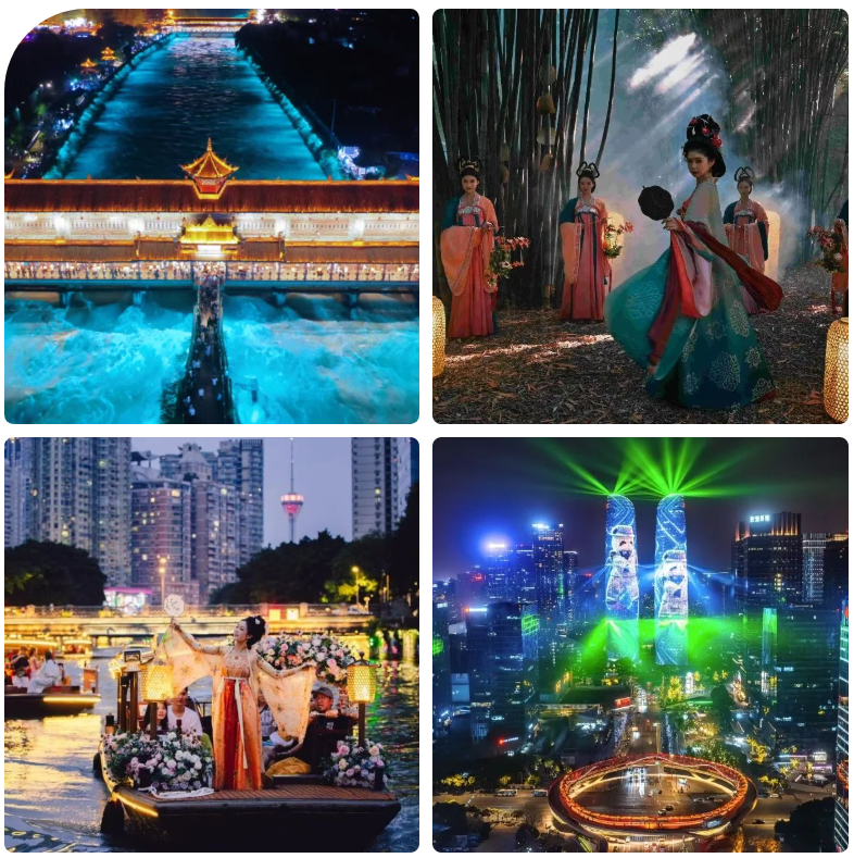 This route features numerous attractions, including Jinjiang River Night Cruise, Dujiangyan Covered Bridge, Jiaozi Avenue, Liulangwan Night Market, and a wide range of performances, such as Chengdu Xue Tao.