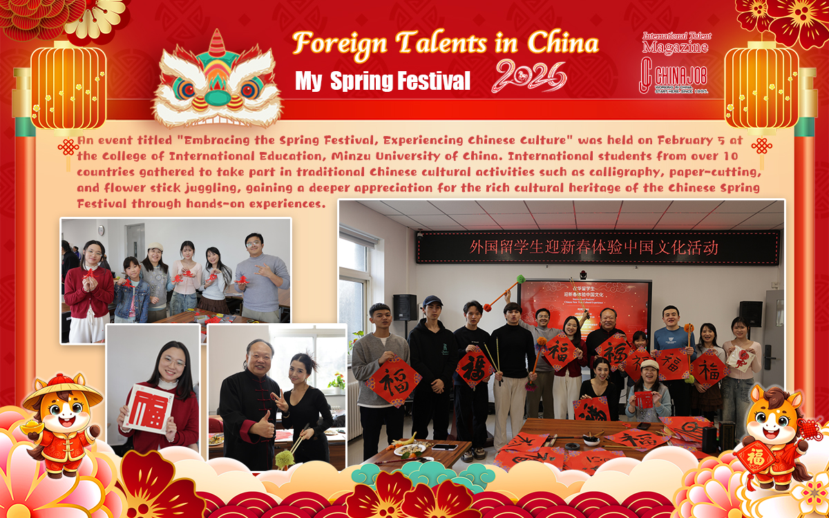 An event titled "Embracing the Spring Festival, Experiencing Chinese Culture" was held on February 5 at the College of International Education, Minzu University of China. International students from over 10 countries gathered to take part in traditional Chinese cultural activities such as calligraphy, paper-cutting, and flower stick juggling, gaining a deeper appreciation for the rich cultural heritage of the Chinese Spring Festival through hands-on experiences.