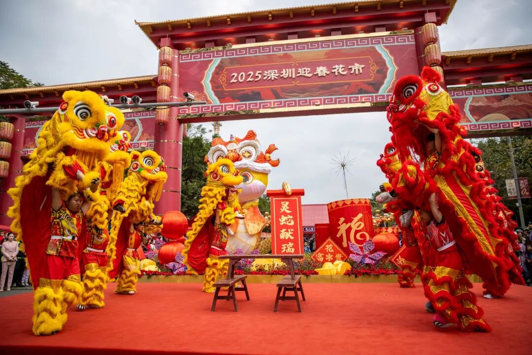 A lion dance performance at th e 2025 Aiguo Road Flower Fair.