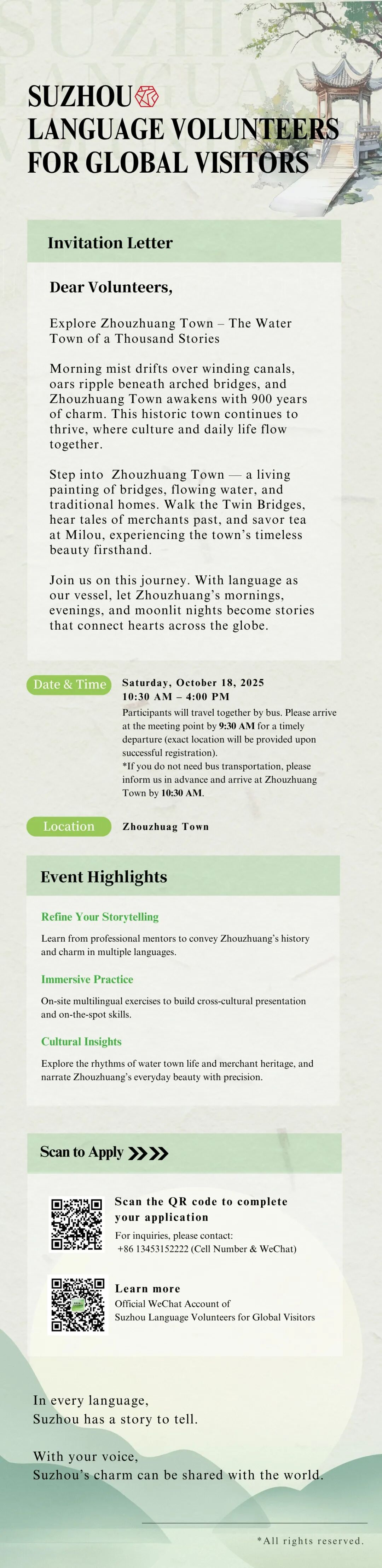 This activity is open exclusively to registered volunteers of the Suzhou Language Volunteers for Global Visitors. Spots are limited, and each language group has a maximum number of participants. Registration is on a first-come, first-served basis. Please register by 24:00 on Wednesday, October 15, 2025 by scanning the QR code on the poster and filling out the form with accurate information. Registration results will be confirmed by October 17.