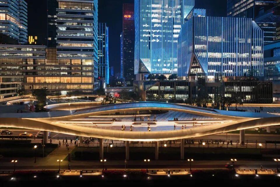 In addition to improving mobility, the bridge incorporates leisure spaces, including a dry fountain plaza, nearly 3,000 square meters of landscaping, and an open-air theater.
