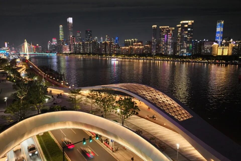 A key feature is the 67-meter-wide curved platform known as "The Kiss of the Pearl River". An intelligent lighting system illuminates the bridge at night, creating a "dancing ripples" effect.