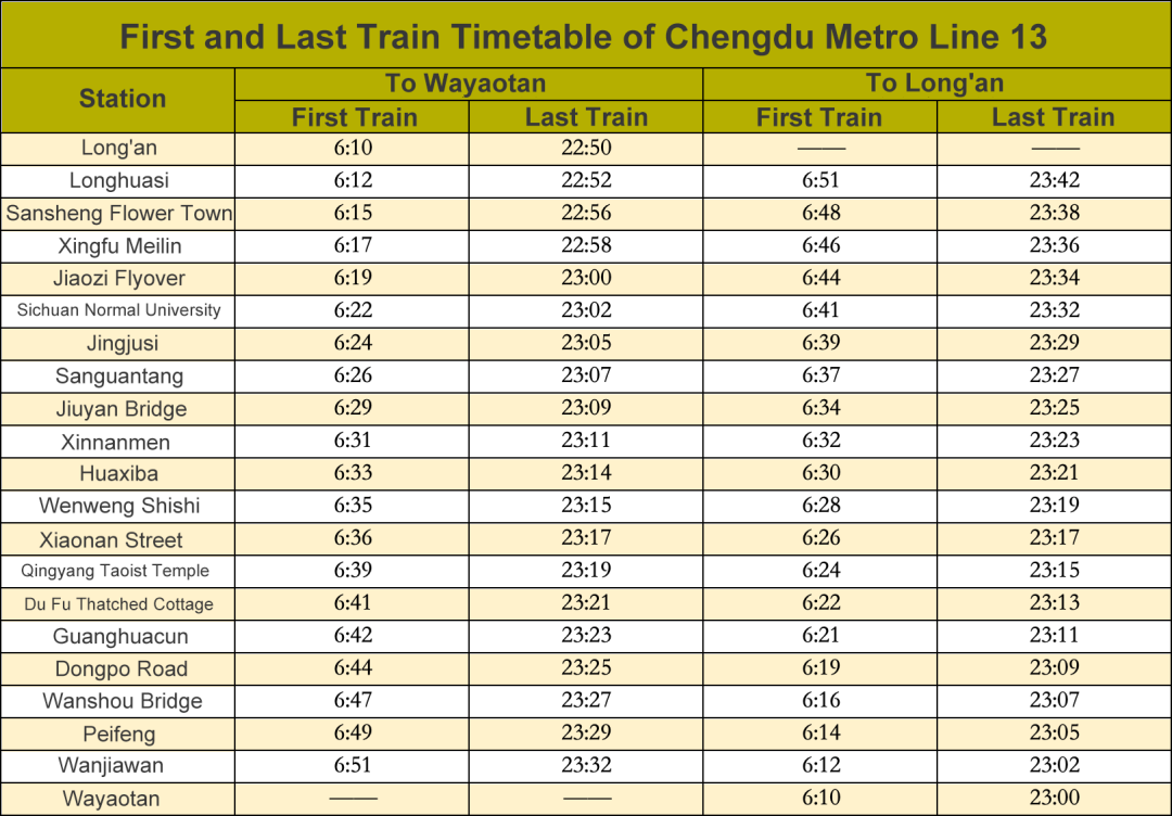 The one-way journey takes approximately 43 minutes. The first train from Wayaotan Station departs at 06:10 and the last train departs at 23:00. The first train from Long’an Station departs at 06:10 and the last train departs at 22:50.