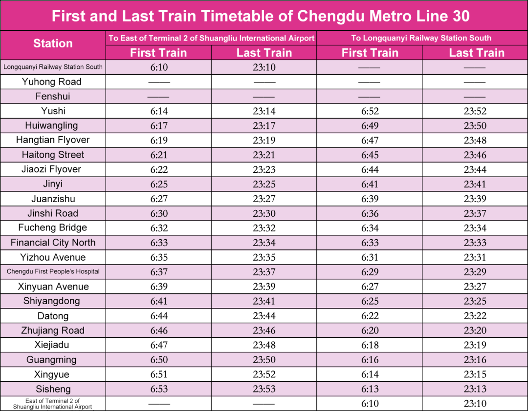 The one-way journey takes approximately 46 minutes. The first train from East of Terminal 2 of Shuangliu International Airport Station departs at 06:10 and the last train departs at 23:10. The first train from Longquanyi Railway Station South Station departs at 06:10 and the last train departs at 23:10.