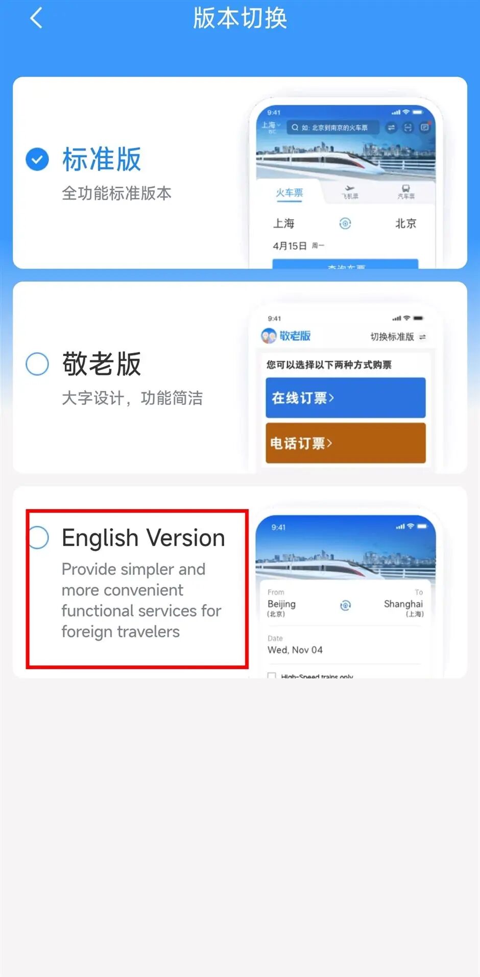 The 12306 ticketing platform can be switched to an English interface for easier use by foreigners. Here's how: