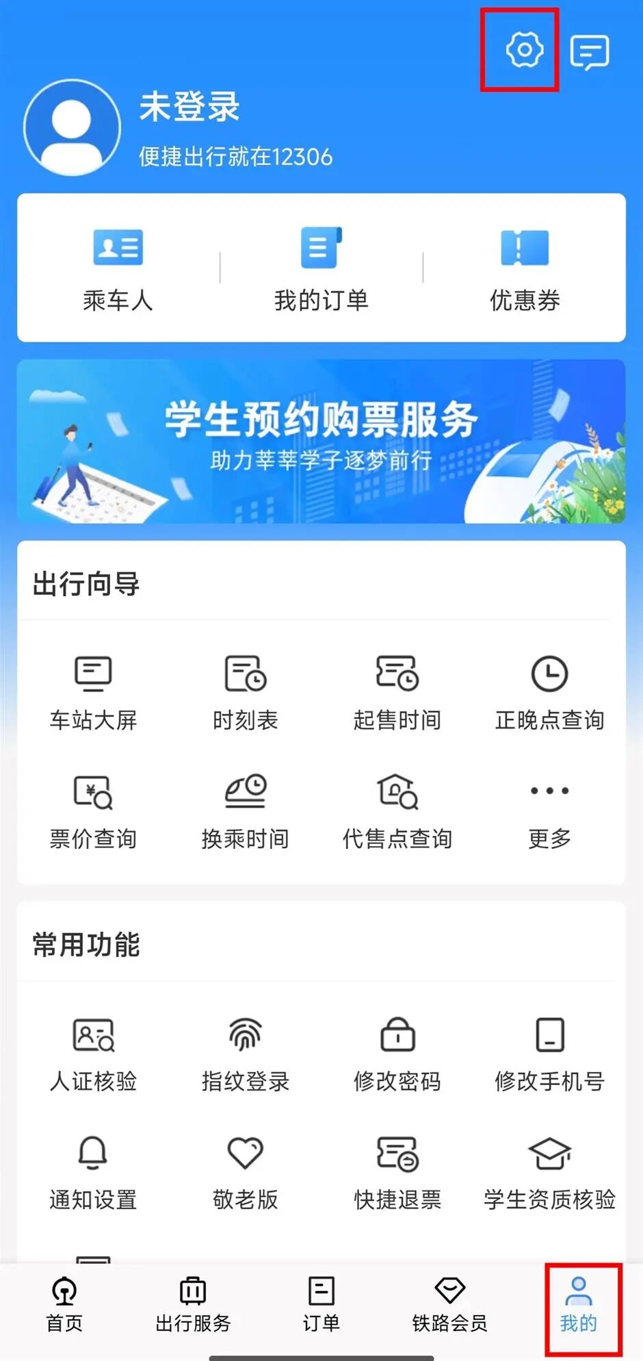 1. Open the 12306 app, tap "我的," then tap the settings icon in the top right.