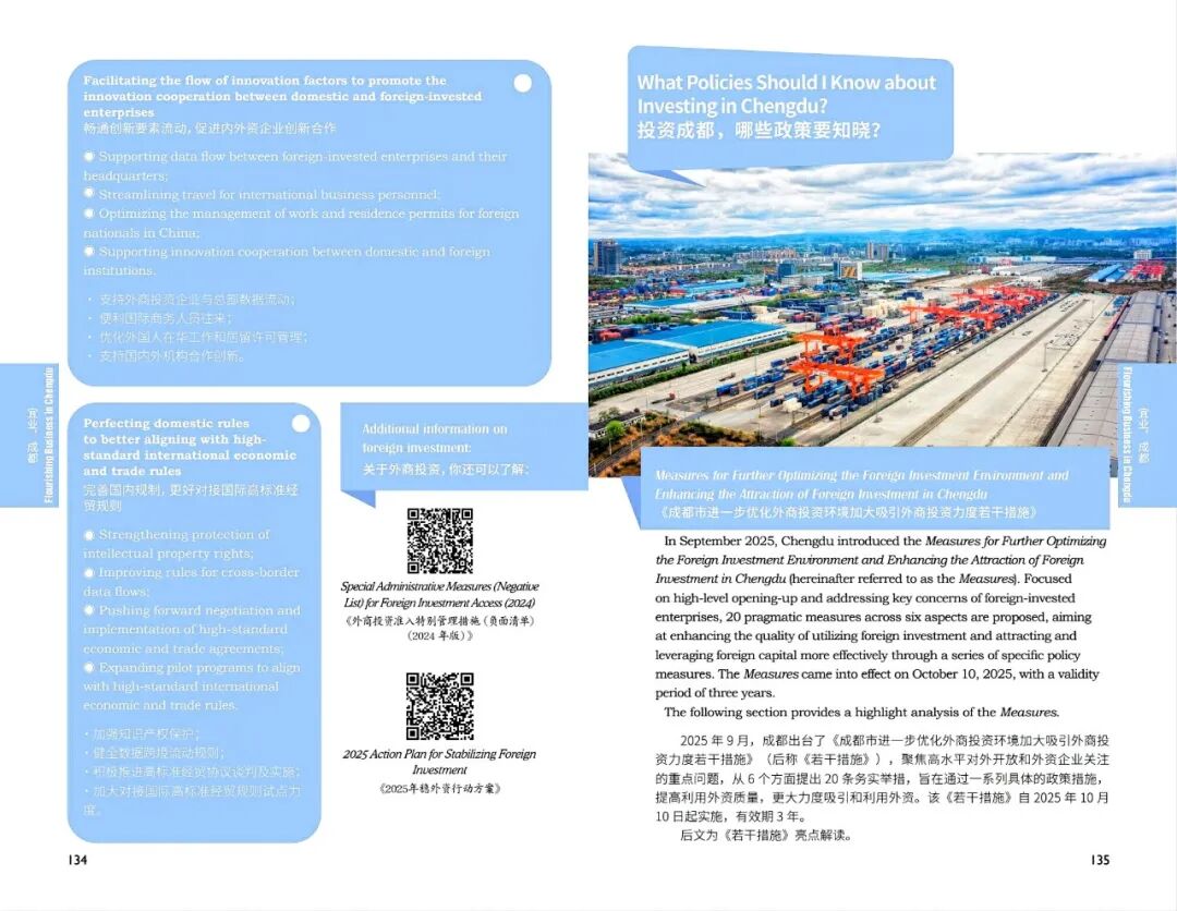 1. New sections have been added to address questions related to investment and entrepreneurship in Chengdu, including 2025 Action Plan for Stabilizing Foreign Investment , 2025 Chengdu Investment Guide , Chengdu 2025 Key Projects Plan , and Chengdu’s Measures to Further Optimize the Foreign Investment Environment and Enhance the Attraction of Foreign Investment.