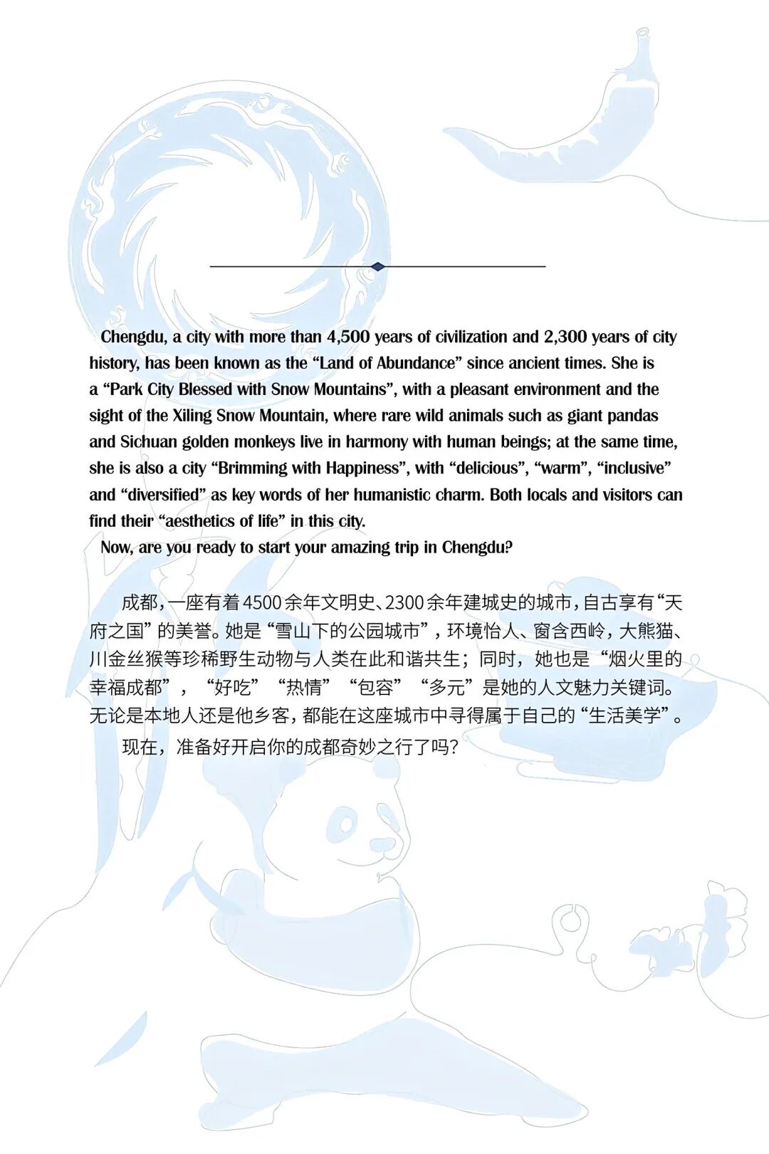 The Foreign Affairs Office of the People’s Government of Chengdu Municipality has recently revised the digital version of the bilingual city guide, Home in Chengdu Living Guide (hereinafter referred to as the Guide). By introducing the latest policies and updated useful information, the revised edition promises to provide more attentive services for foreign nationals and attract them to come to, integrate into, and stay in Chengdu. It aims to expedite the city’s development as a hub for international exchange and a modern international metropolis in China.