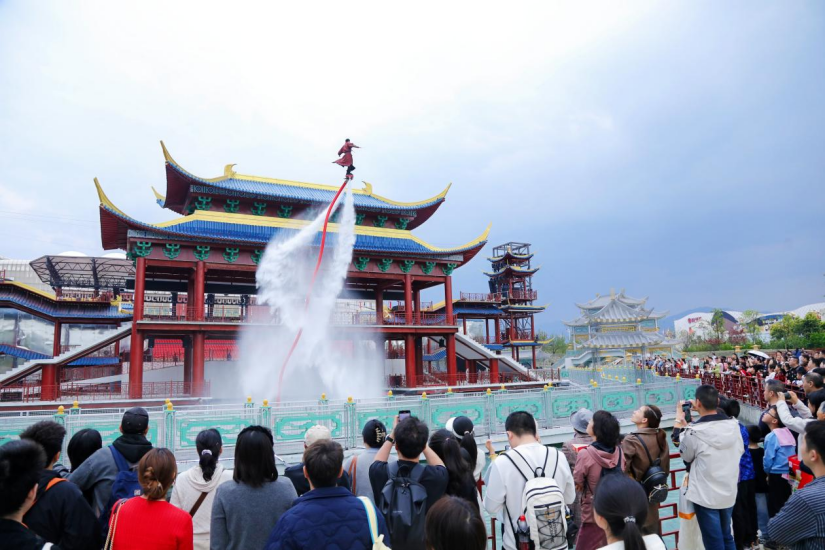 The “Journey Back to Mount Qingcheng” Performance Park is presented by Sunac Resort. It features two top-class real-scene performances, “Journey Back to Mount Qingcheng” and “Ma Chao Guards Dujiangyan”, alongside four themed parades—the Chinese-style Xianxia (immortal heroes), the Giant Golden Horse, the Flower Queen, and Pandas. Over 100 interactive ambient performances are presented on average every day.