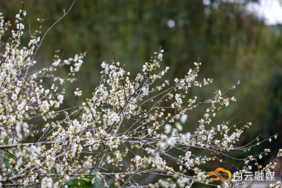 Shimen National Forest Park's "Shimen Xiangxue" area features a 30,000-square-meter plum forest dominated by green plums. Now at peak bloom, dense blossoms create a snow-like "fragrant snow" spectacle, filling the forest with a refreshing scent.