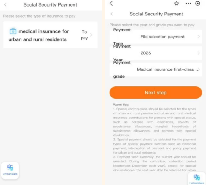 Select the insurance type as "Urban and Rural Residents' Basic Medical Insurance", click "Next Step" to further confirm the payment year and the premium. The default payment year is 2026 and the premium is 200 yuan annually per person. Click "Next Step" to enter the payment interface and click "To Pay" to complete the process.