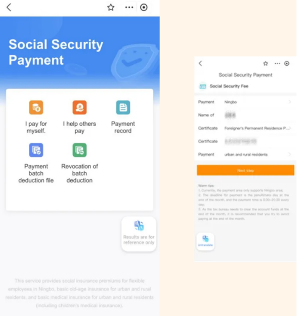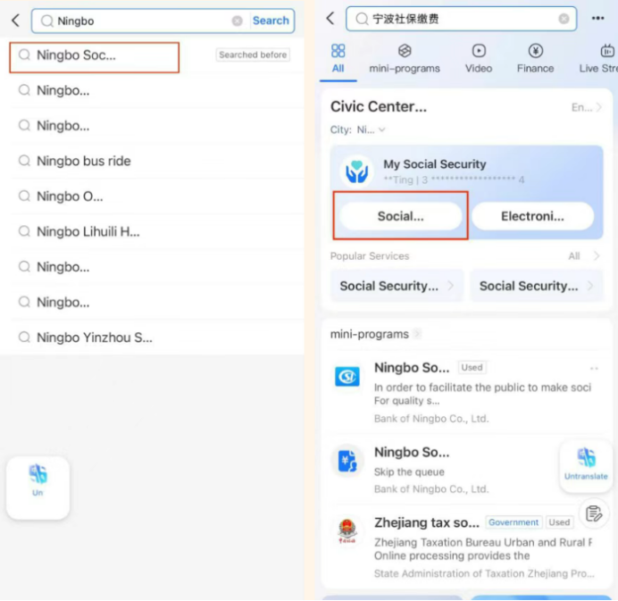 Method 1: Search for "Ningbo Social Security Payment"in Alipay, and click the "Social security payment" button to start the process.