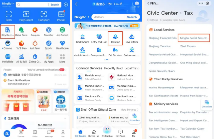Method 2: Click the "City Service" icon on the homepage of Alipay, enter the "Taxation" section, and click the "Ningbo Social Security Payment" to start.