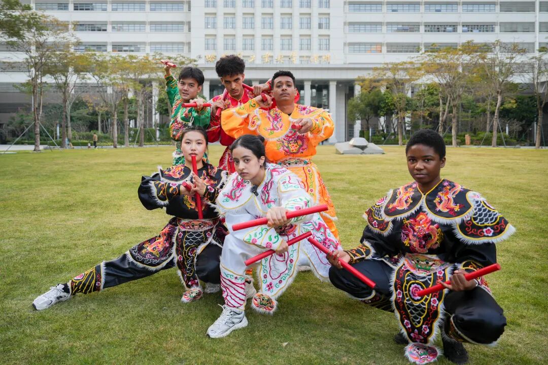 Interntional Gen Zers from HITSZ donning Yingge Dance costumes and holding twin red batons pose for a photo Jan. 18.