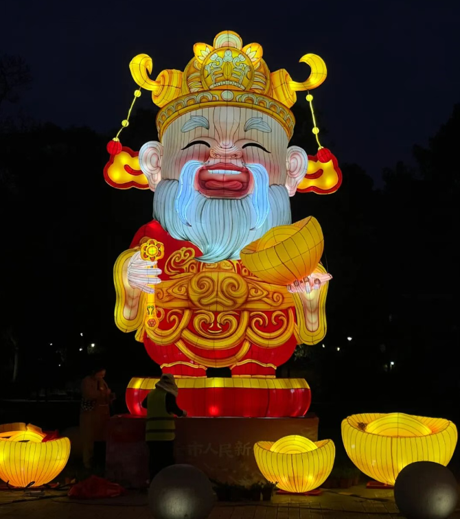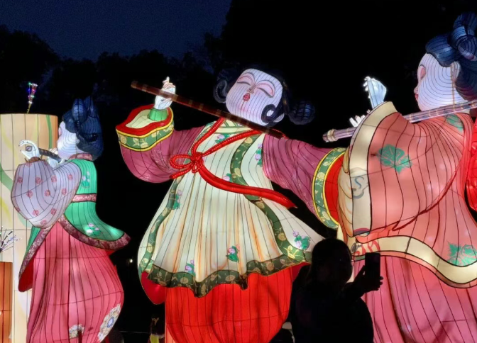 The south gate is decorated with two phoenix lanterns and numerous peony lanterns, symbolizing auspicious blessings. Walking further inside, visitors will be greeted with lanterns featuring diverse shapes: Tang-style female dancers, the God of Wealth, koi and plum blossoms. Every step reveals a new photo-worthy scene.