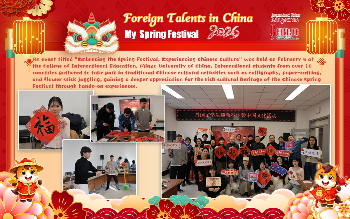 An event titled "Embracing the Spring Festival, Experiencing Chinese Culture" was held on February 5 at the College of International Education, Minzu University of China. International students from over 10 countries gathered to take part in traditional Chinese cultural activities such as calligraphy, paper-cutting, and flower stick juggling, gaining a deeper appreciation for the rich cultural heritage of the Chinese Spring Festival through hands-on experiences.