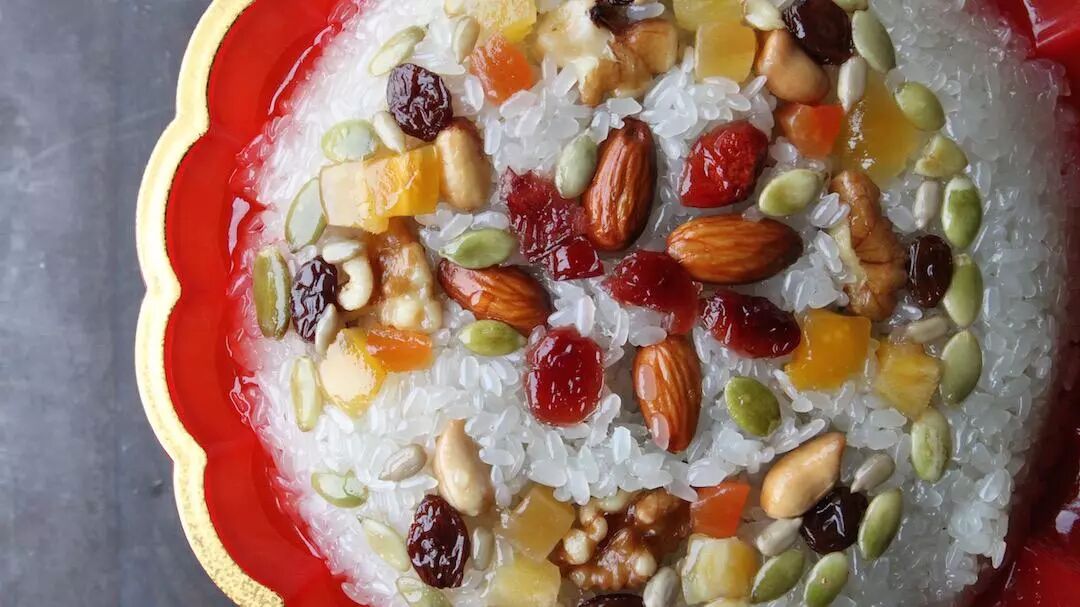 Ba bao fan (八宝饭), or eight treasures rice, is a sweet sticky rice dish that is popular for Chinese New Year celebration. The colorful dish is generally decorated with various fruits and nuts, and contains a sweet core of red bean paste. The mouthwatering dessert is famous in Shanghai and the southern regions of China.