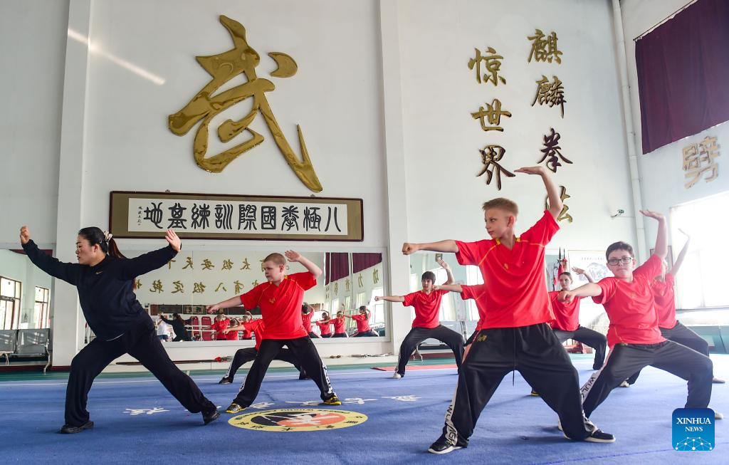 A coach leads Russian students to practice Bajiquan, a powerful style of Kung Fu, at a training base in Qingxian County, Cangzhou City, north China's Hebei Province, June 25, 2025. A Bajiquan training base in Qingxian County welcomed this year's first batch of international students from Russia, who will learn the traditional Bajiquan and experience the Chinese martial arts culture. (Photo by Fu Xinchun/Xinhua)