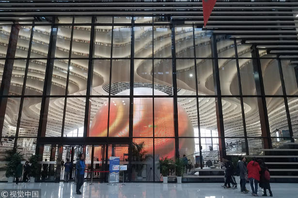 An exterior view of the Tianjin Binhai New Area Library in Tianjin. The library, which features terraced shelves and cascading ceiling-to-floor bookcases, is drawing many visitors as well as readers. [Photo/VCG]
