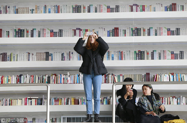 People take photos in the library. [Photo/VCG]