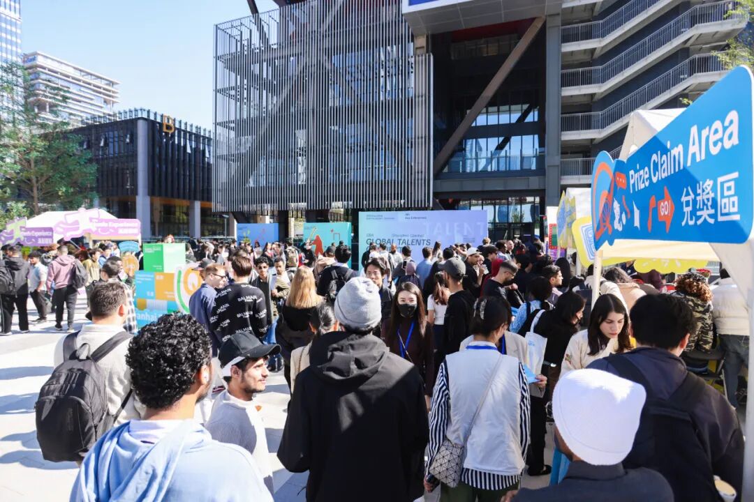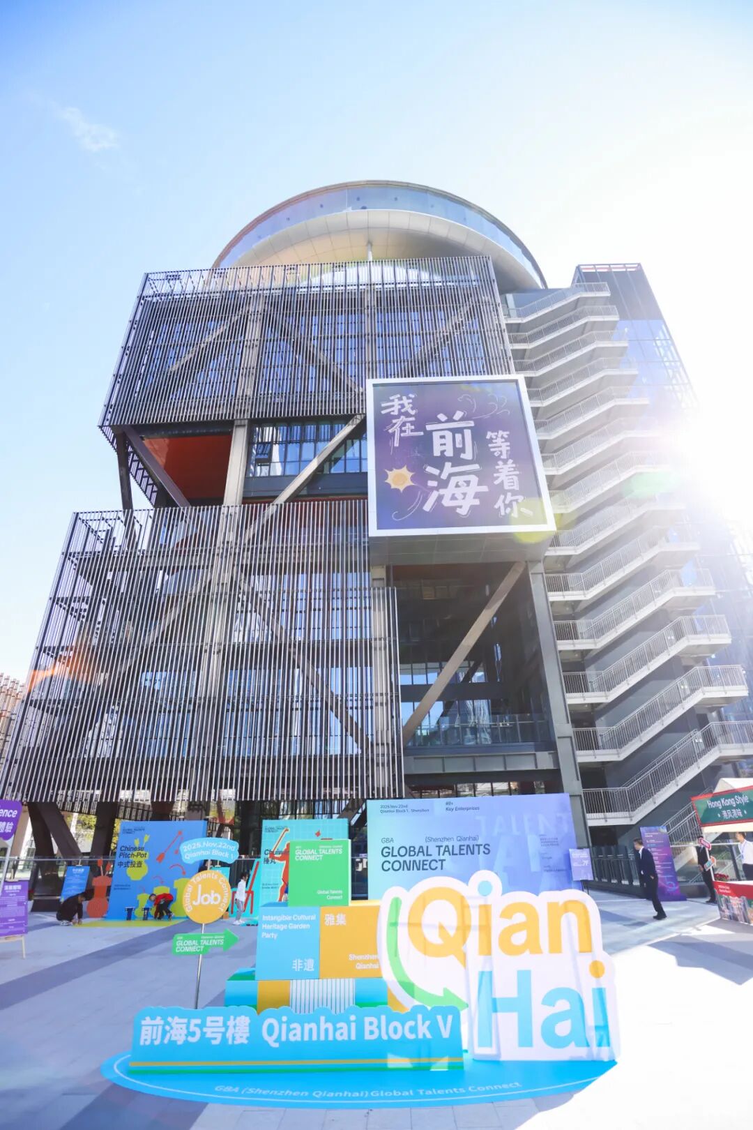 Attendees gather outside Qianhai Block V for a talents connect fair, where cultural activities, prize giveaways, and networking zones created a lively atmosphere.
