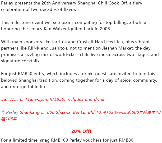 Shanghai Chili Cookoff: 20 Years of Fire @ Parlay