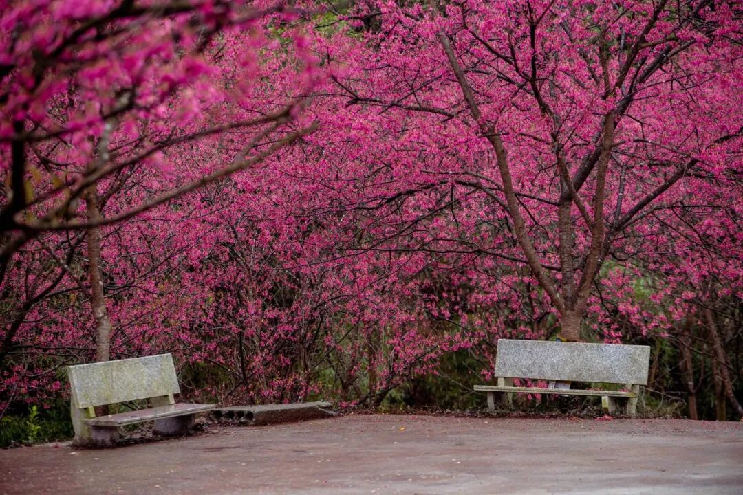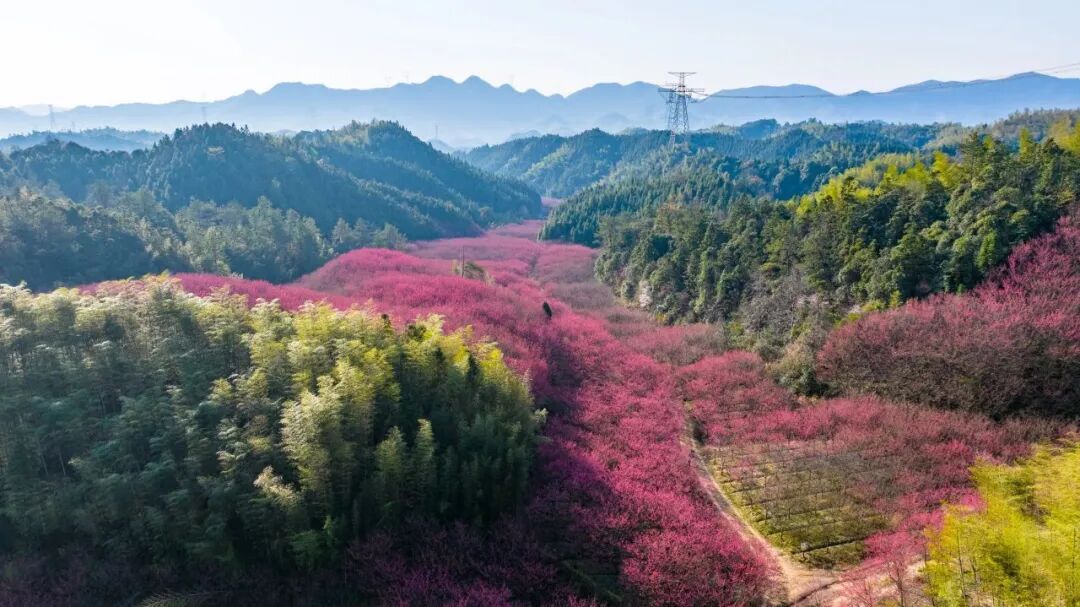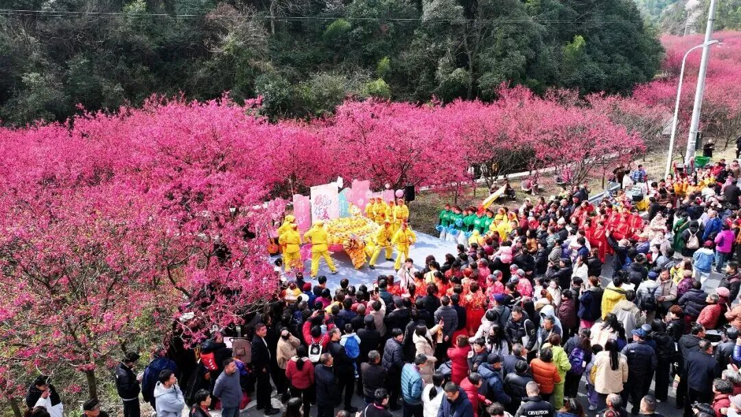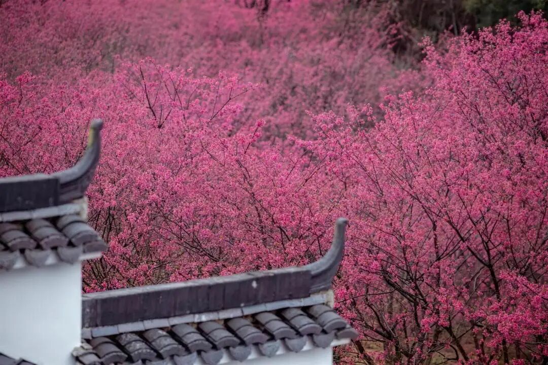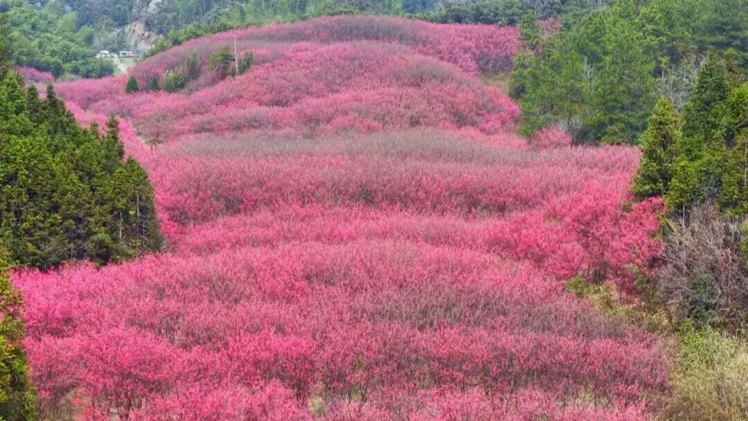 On March 7, the 4th Linglong Miji Cherry Blossom Appreciation Event 2026 officially opened! Located in Miji Village in Linglong Subdistrict of Lin’an District, this nearly 1,000-mu cherry blossom forest is now in full bloom. Around 100,000 “China Red” cherry trees blanket the valley in vibrant crimson. From afar, the blossoms look like soft pink clouds covering the hills. When the spring breeze blows, petals float gently through the air, filling the entire valley with the romance of spring.