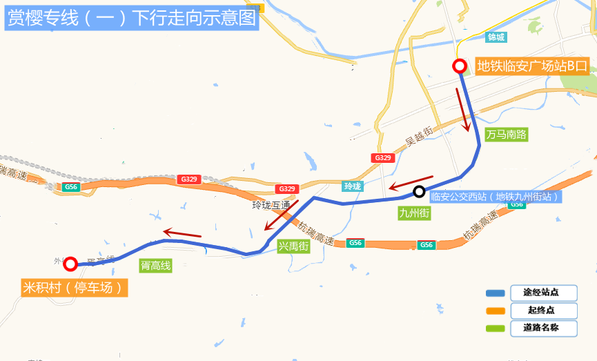 The shuttle passes through Xintang Road, North Huancheng Road, Tianmushan Road, G56, Qianjin Boulevard, Qianwang Street, Wanma Road, and Jiuzhou Street before arriving at Lin’an Bus West Station.
