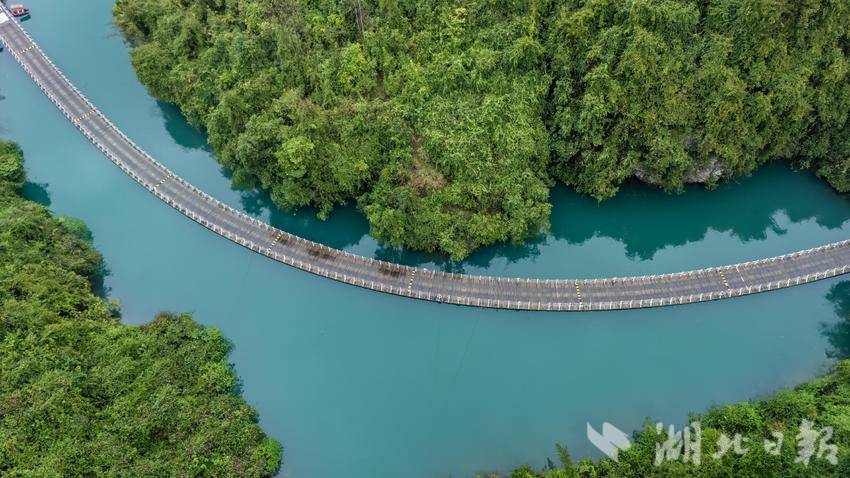 A car driving across a floating bridge in Shiziguan (Lion Pass) Scenic Area, Xuan'en County, Hubei Province....