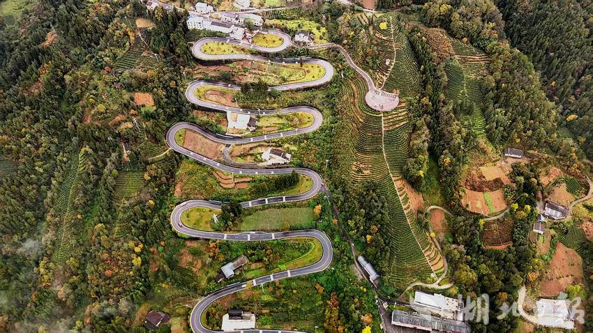 View of ten consecutive hairpin turns along the Baifeng Highway in Taiyanghe Village, Hubei Province....