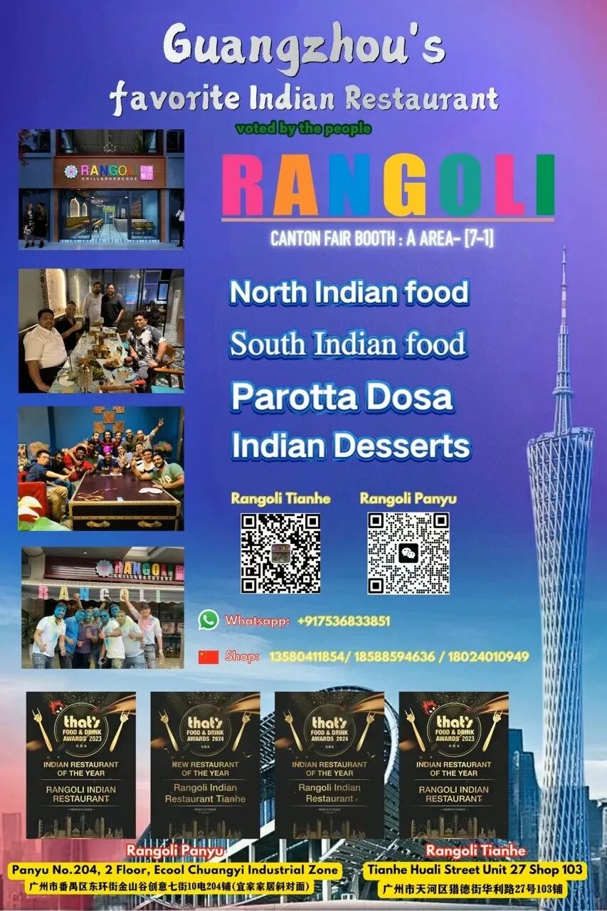 Visit Rangoli's booth in A Zone [7-1] of the Canton Fair for authentic North and South Indian lunch sets—vegetarian and non-vegetarian options available....